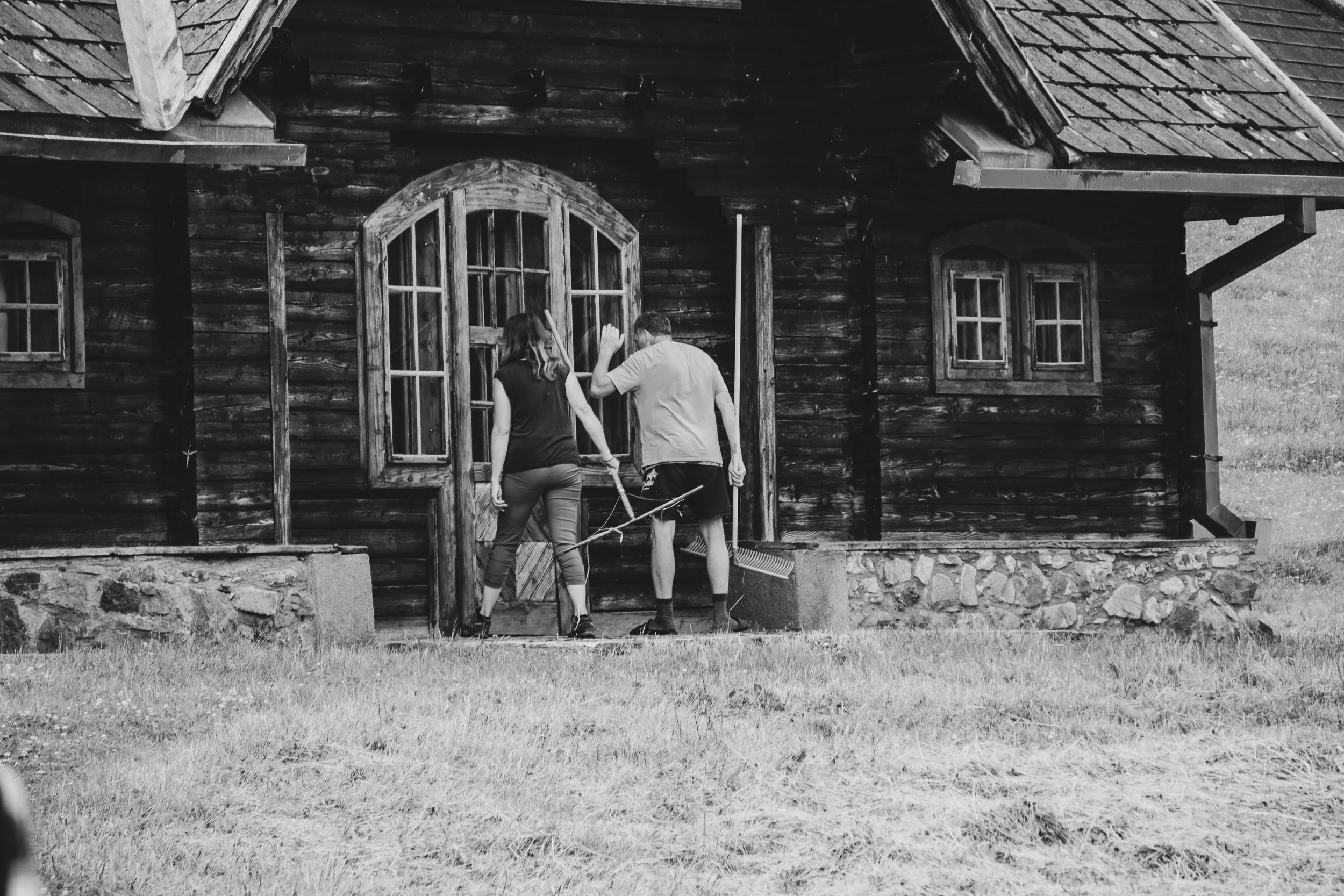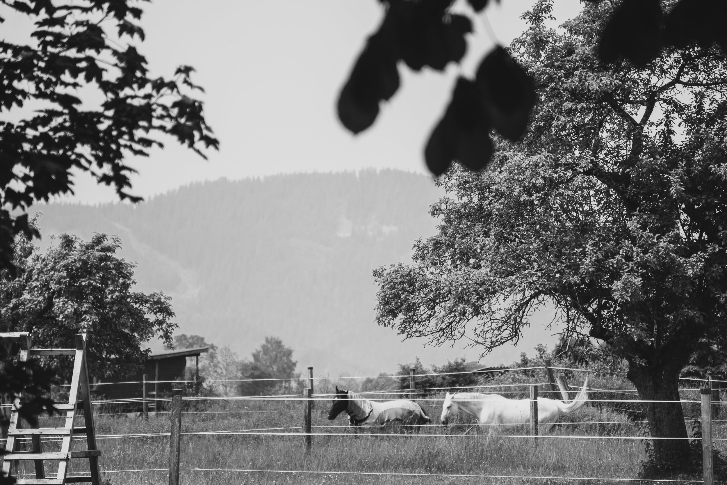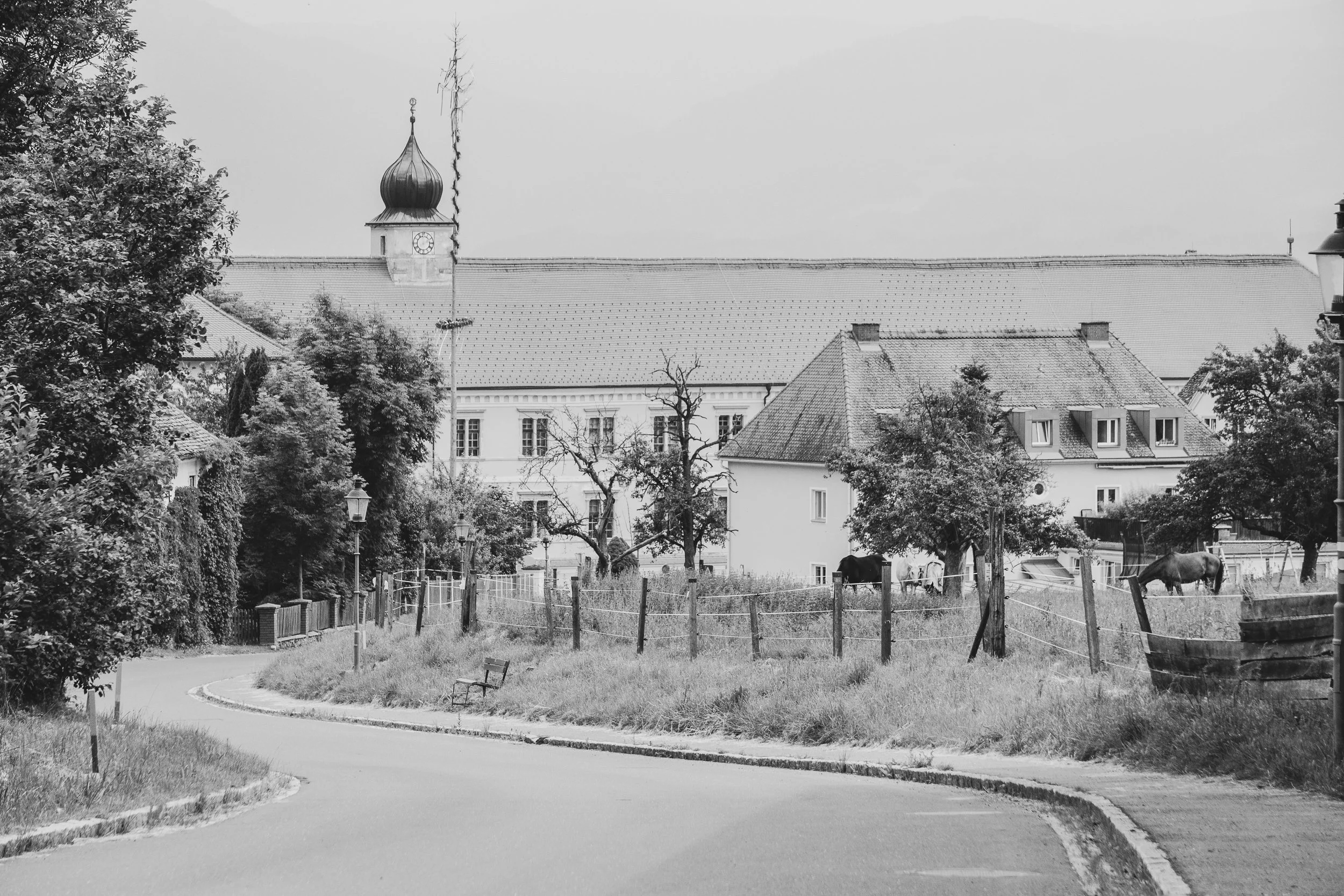 In the afternoon, we drive along small roads between lush fields to "Seckau". At the entrance to the village, beautiful horses play freely in the paddock, while laundry has to go on the line to dry. An old Peugeot is being assimilated by nature, and above the market square, the flags of the Maypole wave cheerfully.